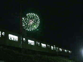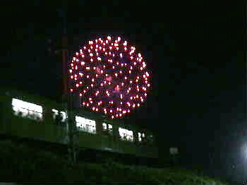 103系と花火! 電車と花火のタイミングが合いません。